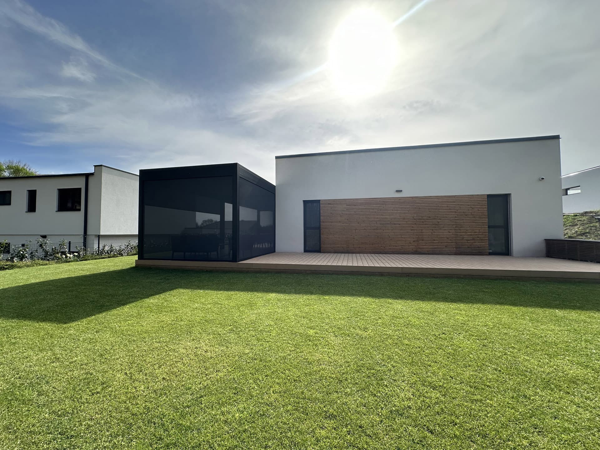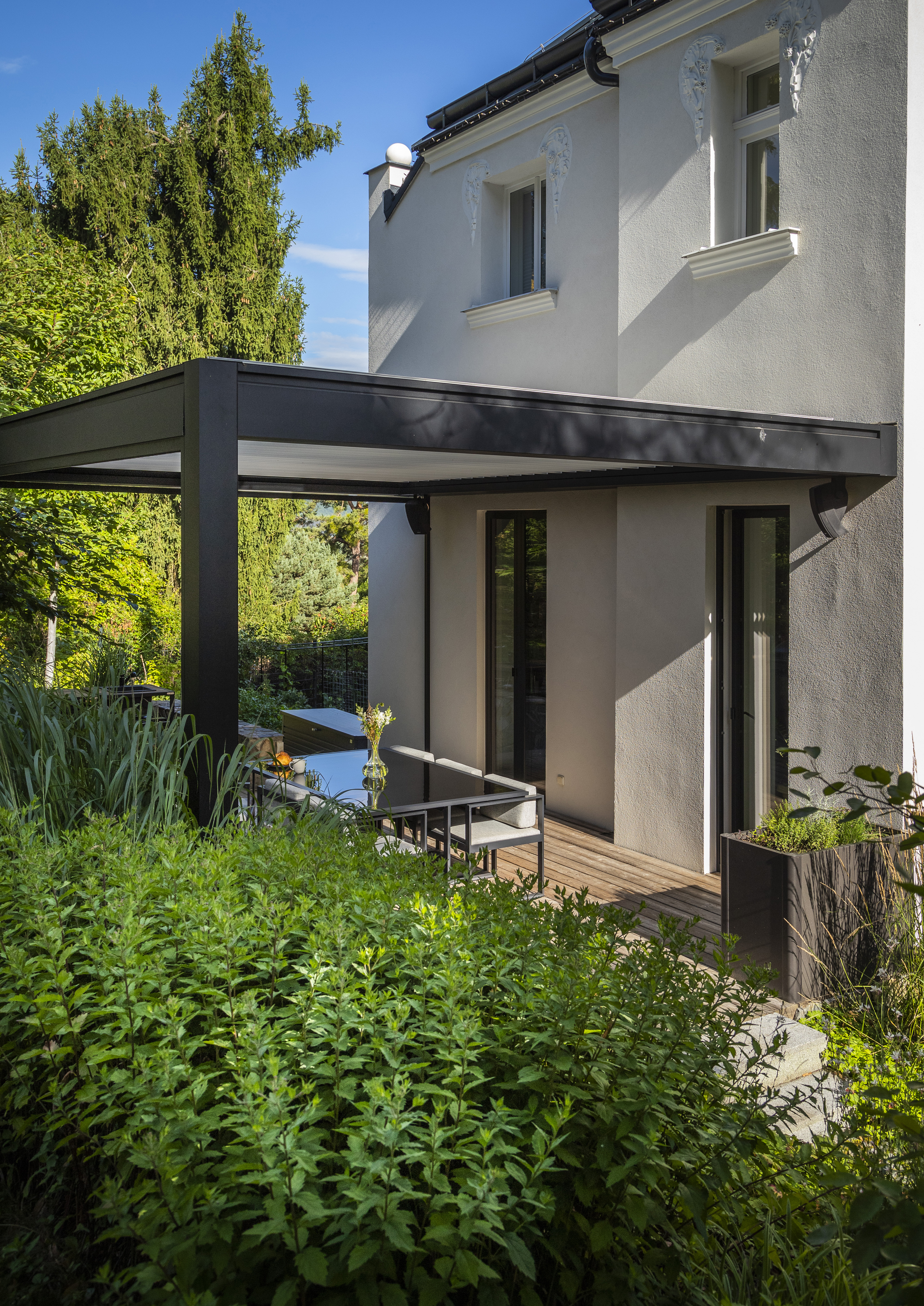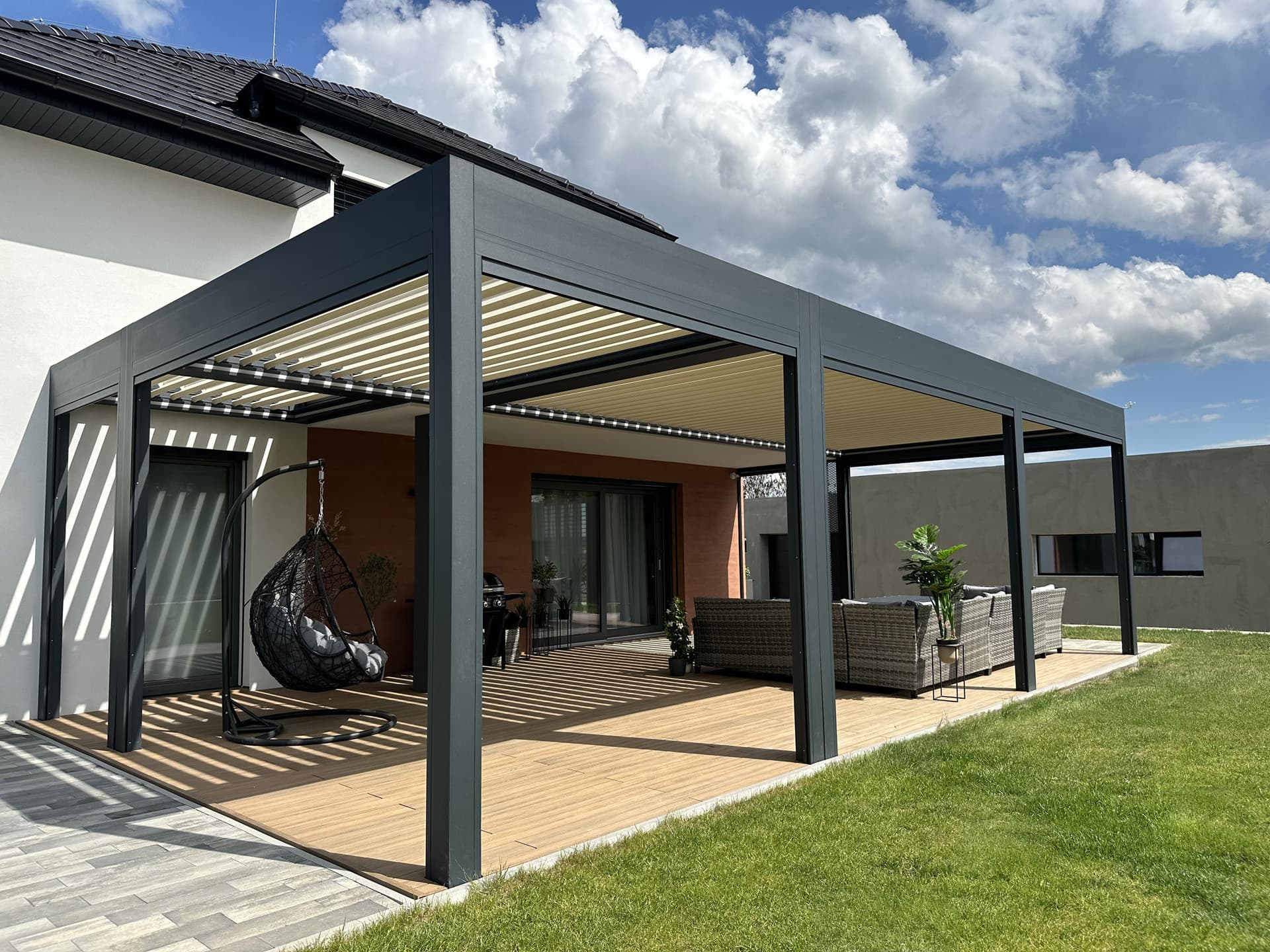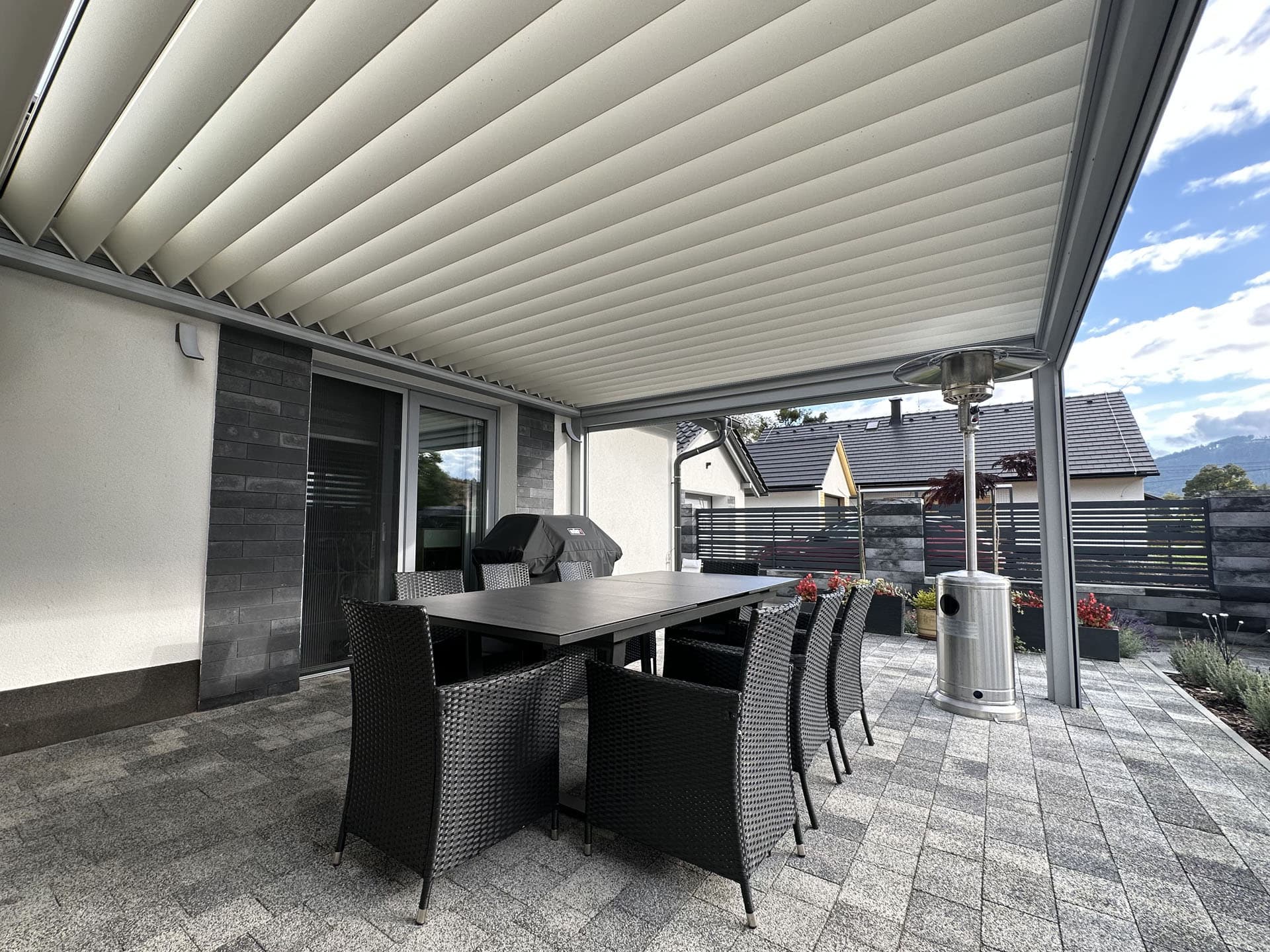 Elegantní stavba doplněná o unikátní 16 metrovou bioklimatickou pergolu Libertas v kombinaci s nezastřešenou hliníkovou konstrukcí se skrytým kotvením do zdi, která vznikla na přání klienta.