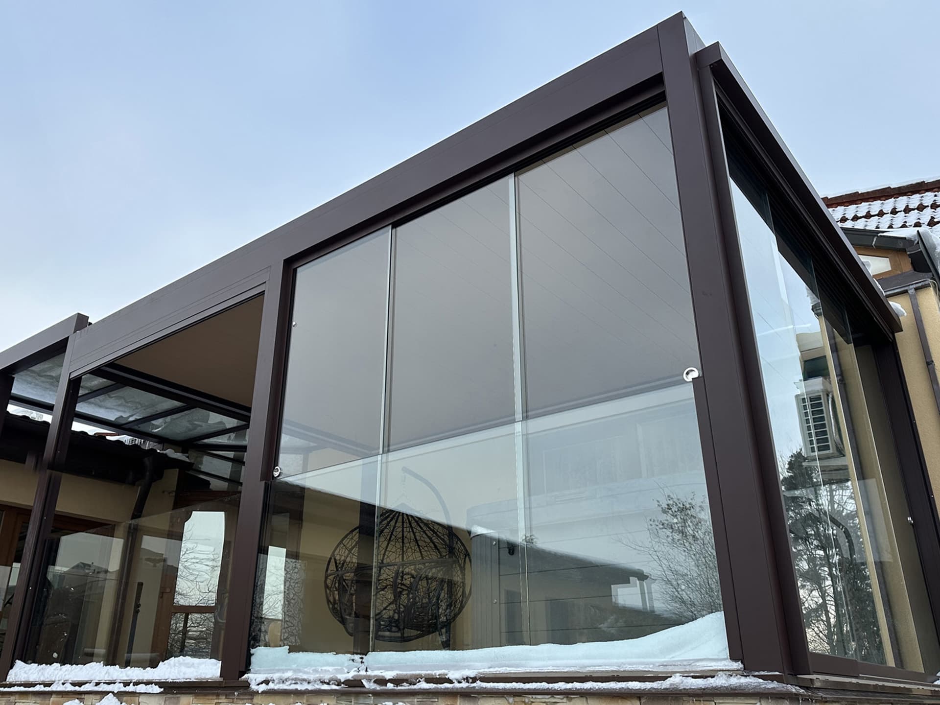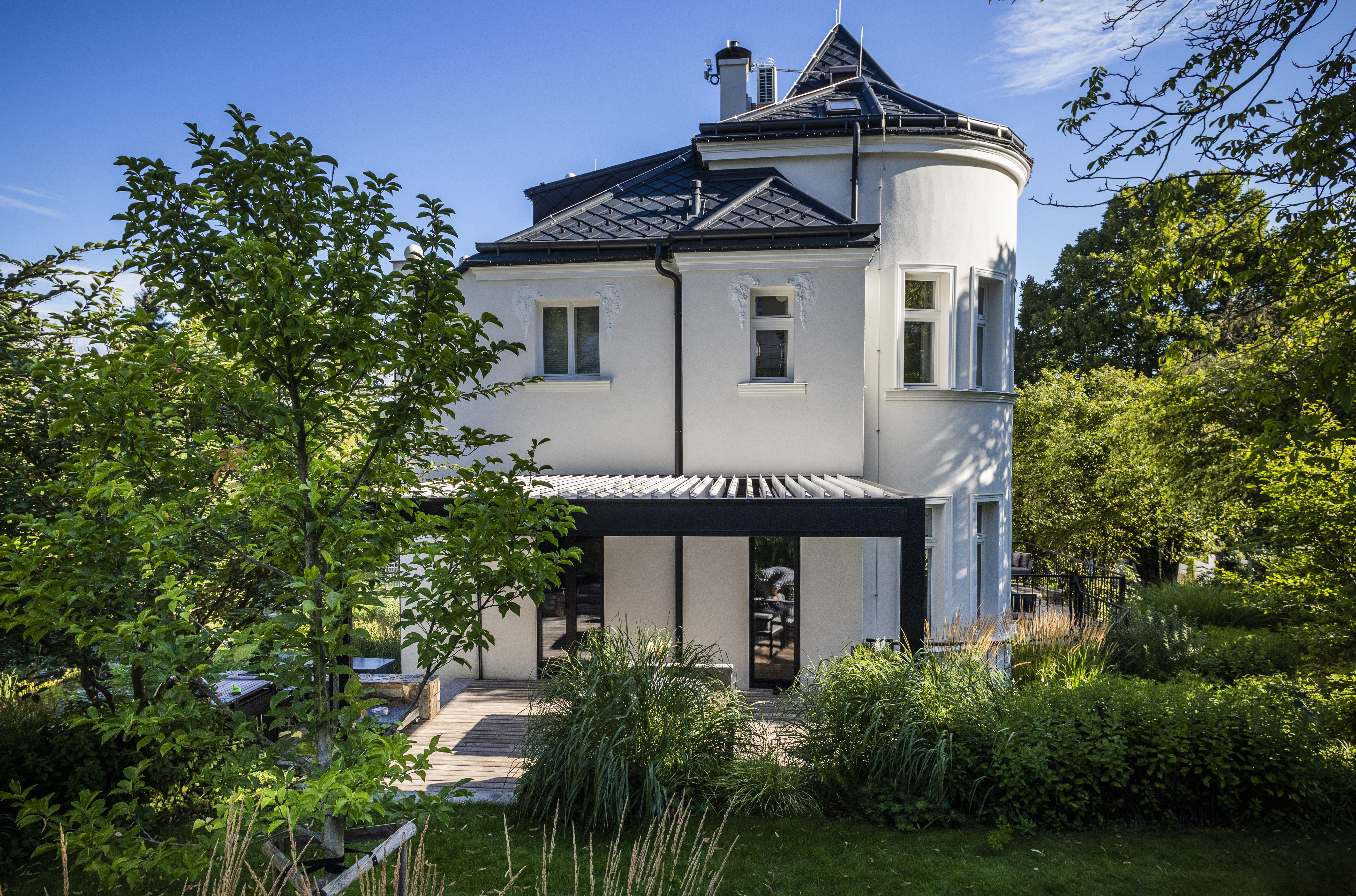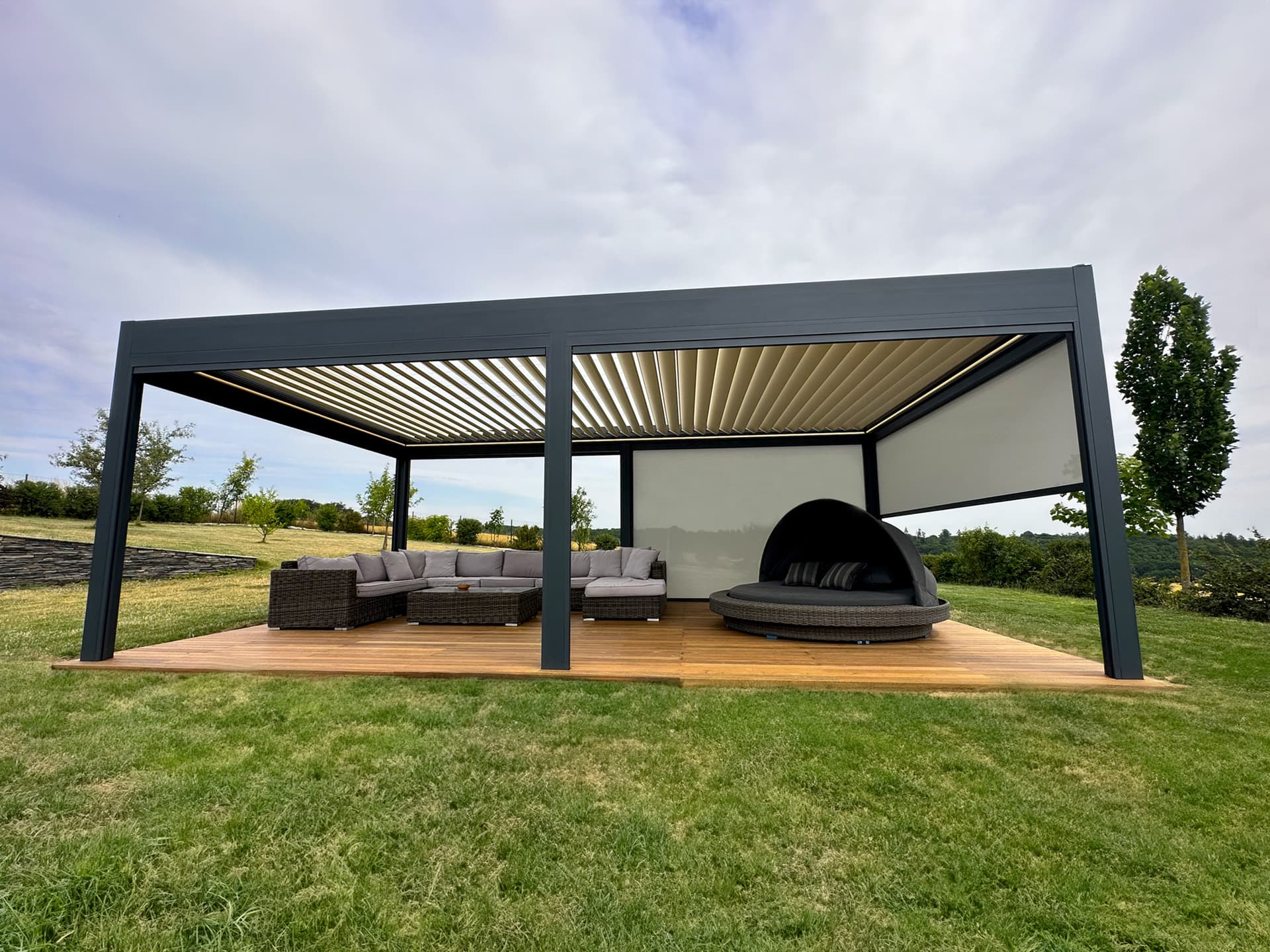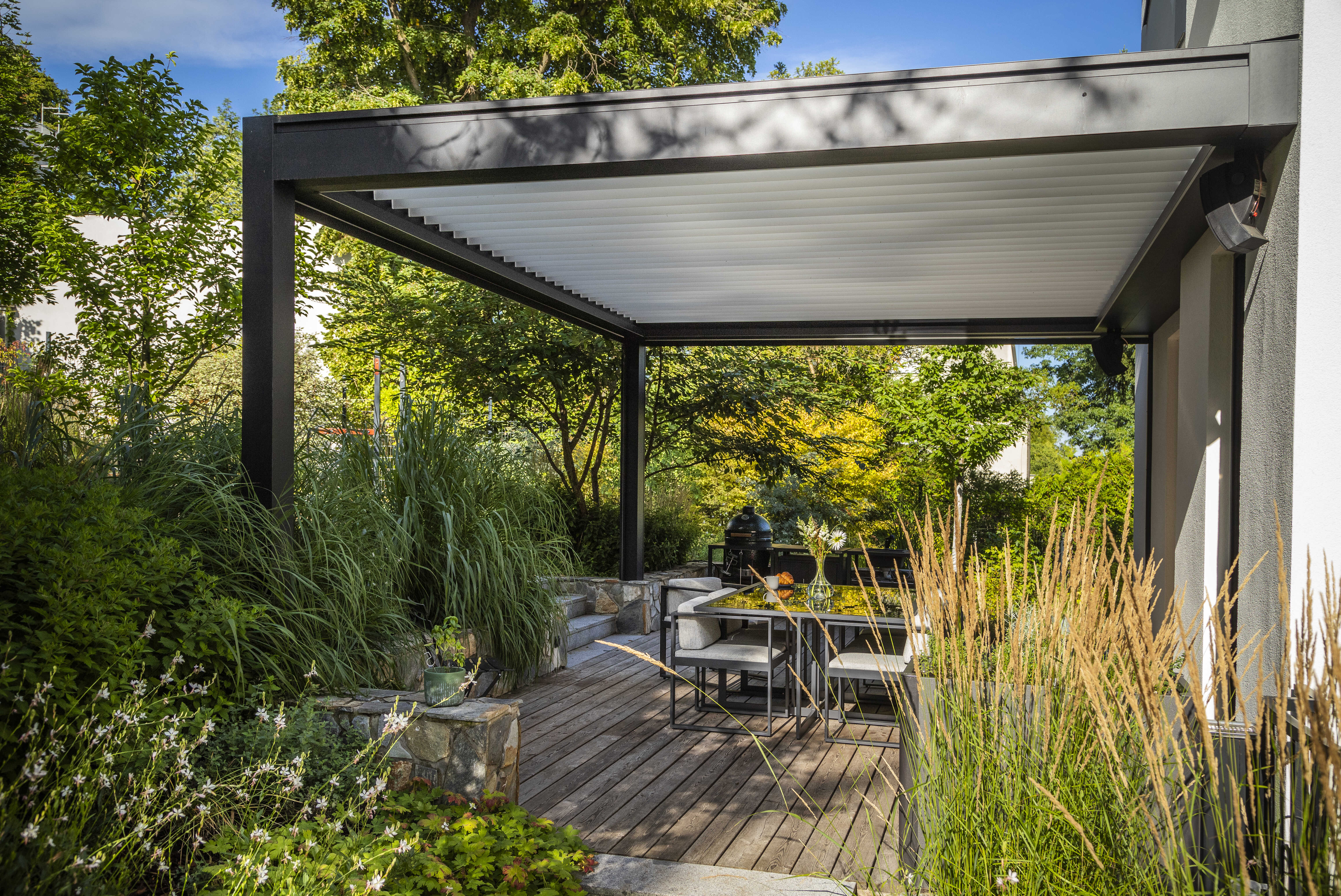 Elegantní stavba doplněná o unikátní 16 metrovou bioklimatickou pergolu Libertas v kombinaci s nezastřešenou hliníkovou konstrukcí se skrytým kotvením do zdi, která vznikla na přání klienta.