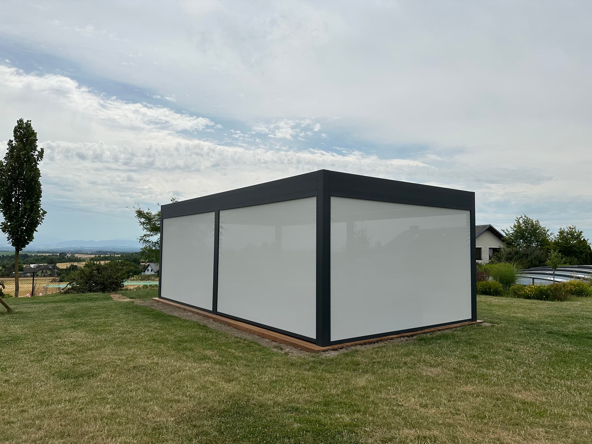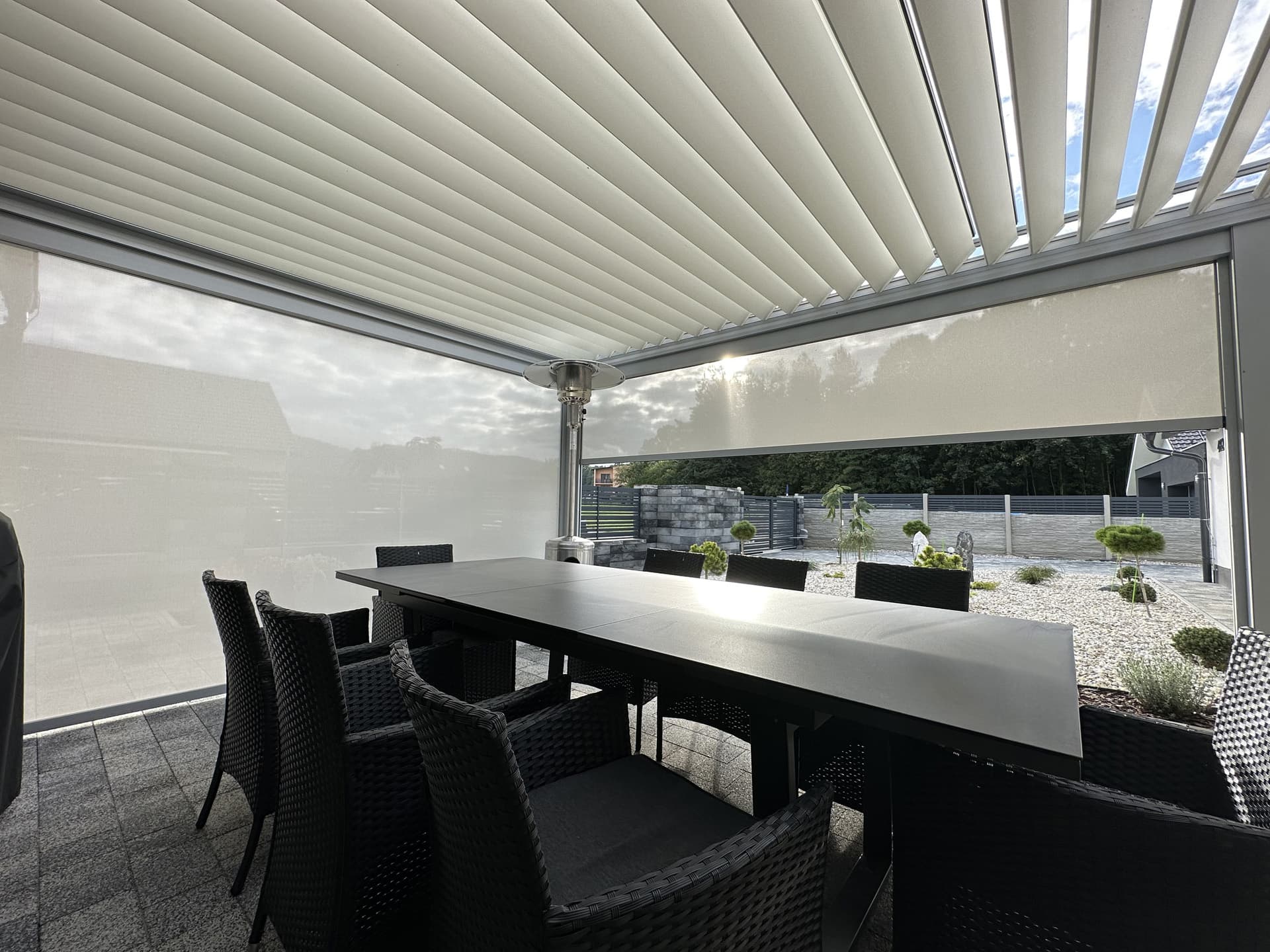 Rozměr: 16x3,5 metru, barva konstrukce: strukturální RAL 7021, barva lamel: strukturální RAL 9006, barva rolet: SC5 / 1010