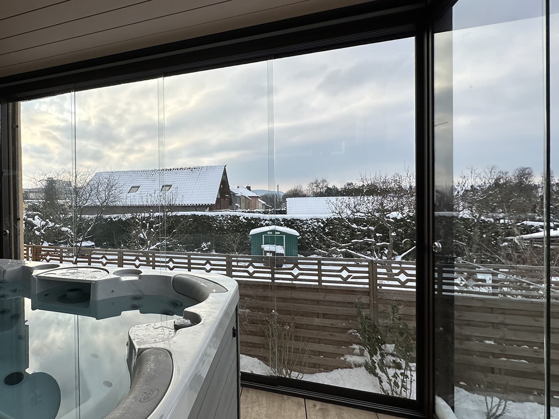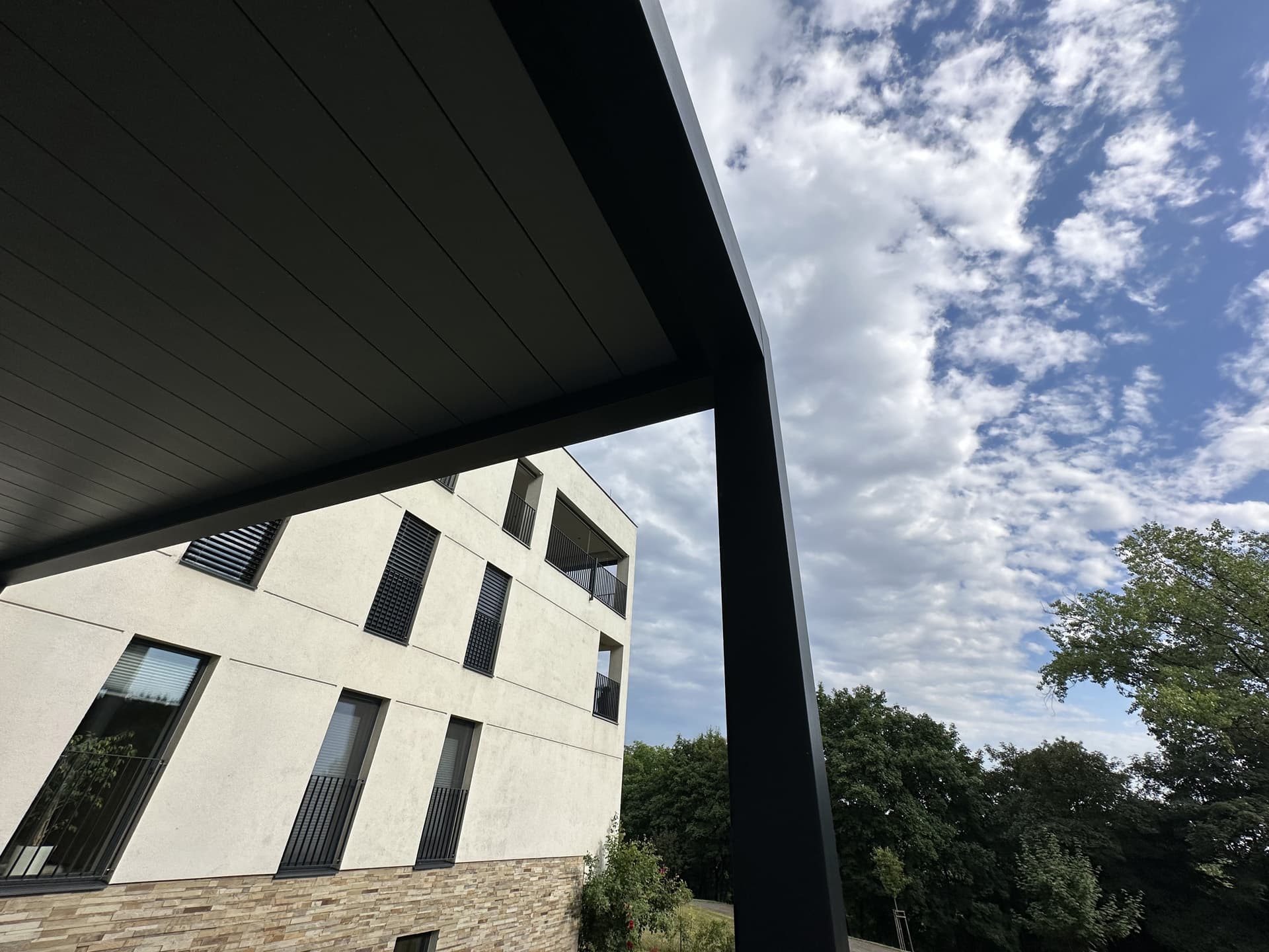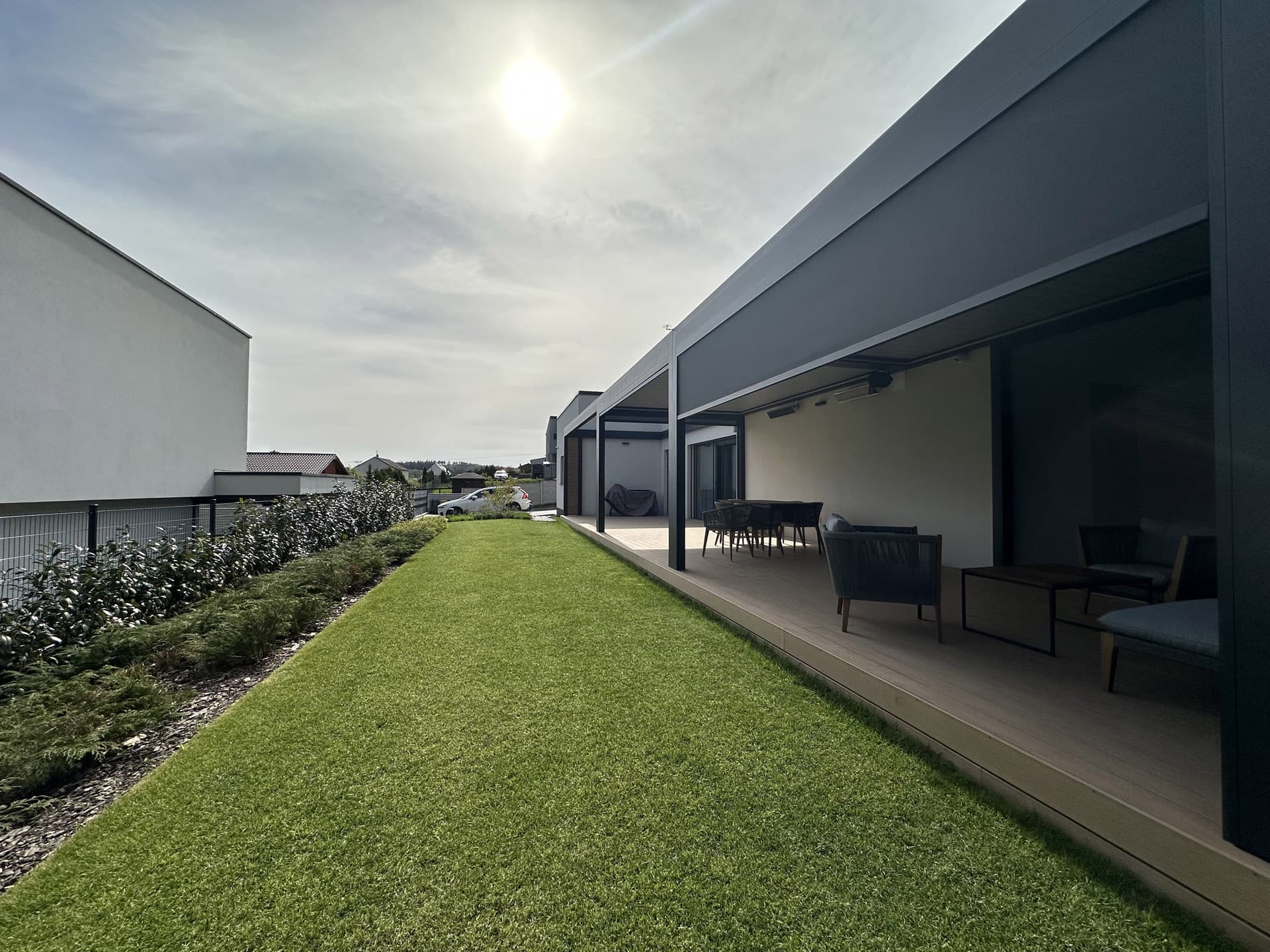 Elegantní stavba doplněná o unikátní 16 metrovou bioklimatickou pergolu Libertas v kombinaci s nezastřešenou hliníkovou konstrukcí se skrytým kotvením do zdi, která vznikla na přání klienta.
